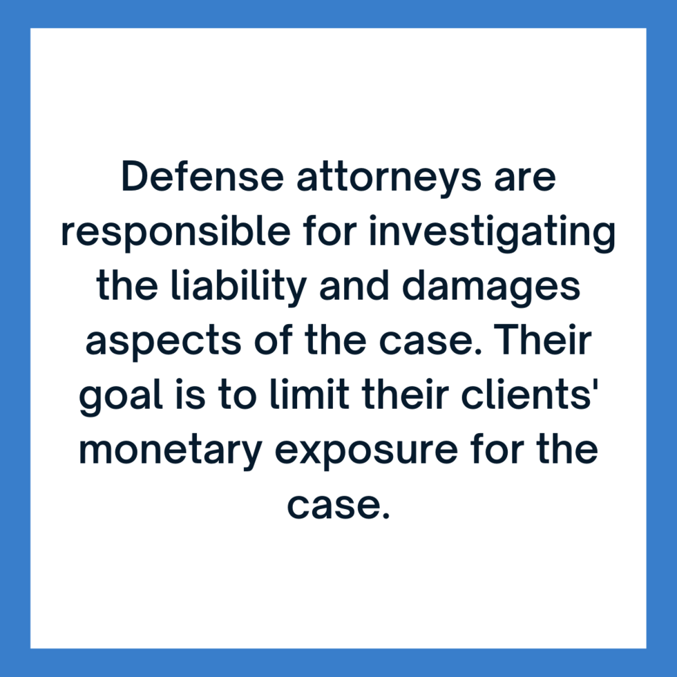 The defense attorney is responsible for representing the at-fault driver, but not in the way you might think. They are responsible for investigating the liability and damages aspects of the case. Their goal is to limit their clients’ monetary exposure for the case. That is, they make sure that the insurance limits will be sufficient to protect their insured’s assets from exposure. Simultaneously, the defense attorney is reporting back to the adjuster for the insurance company’s evaluation of the claim.