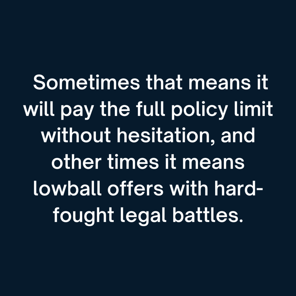 In a liability case, also known as a third party claim, the insurance company only has a duty to protect its own insured. In rough terms, the insurance company’s goal is to pay and do as little as possible to make the claim go away. Sometimes that means it will pay the full policy limit without hesitation, and other times it means lowball offers with hard-fought legal battles.